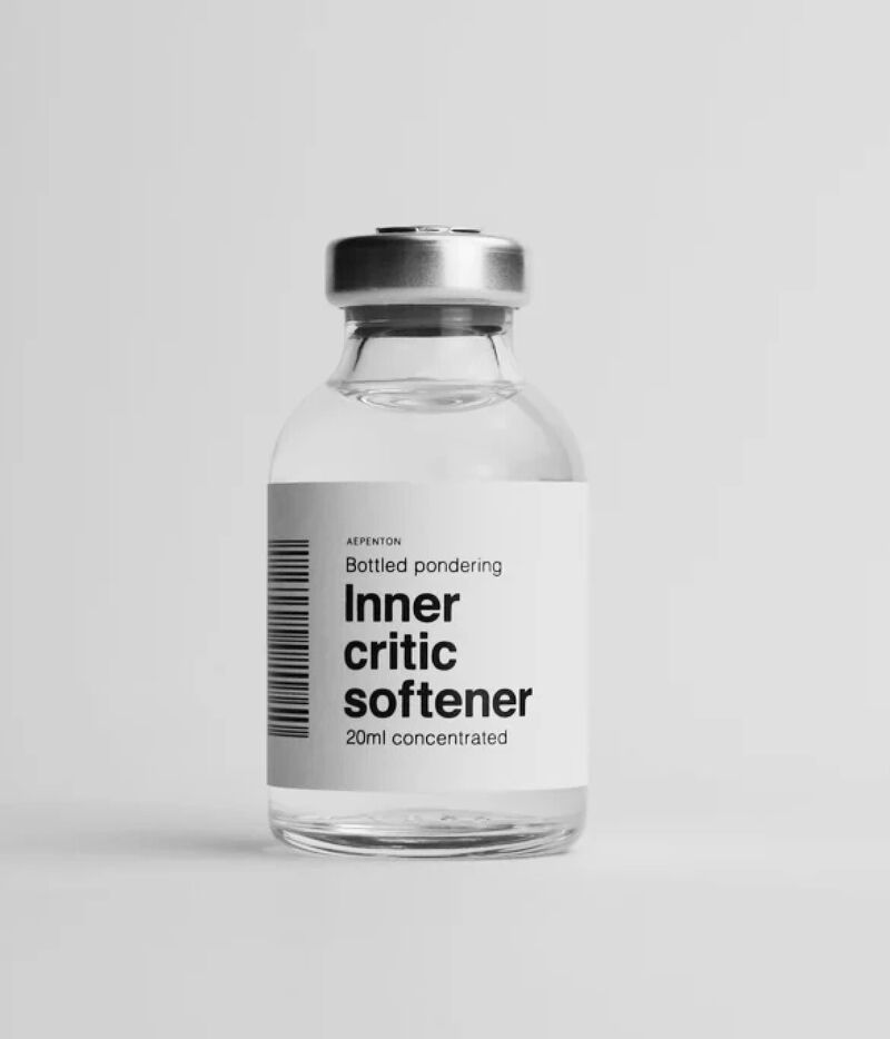 It reminded me of an art project I recently saw at the Design Museum in Copenhagen, a collaboration between Aepenton and the Design Museum Denmark. It was a shelf full of small glass syringe bottles, each labeled with a different emotion or mindset. The one that stood out for me was “Inner critic softener.”