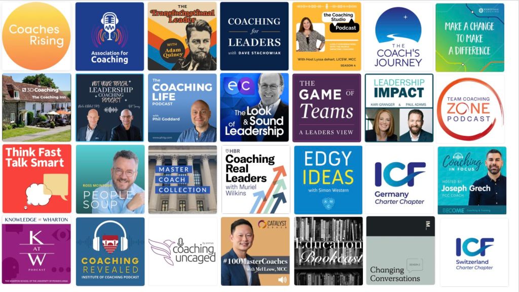 #100MasterCoaches Mel Leow, MCC, Changing Conversations Katrina Marshall Dyrting, Stig Albertsen, Coaches Rising Joel Monk, Coaching for Leaders Dave Stachowiak, Bonni Stachowiak, Coaching Revealed Carol Kauffman PhD and her team, Coaching Uncaged Nick Bolton, Edgy Ideas Dr Simon Western, Education Bookcast Stanisław Pstrokoński, Leadership Impact Kari Granger, Make a Change to Make a Difference Adam Goodman-Smith, Master Coach Collection Gideon Culman, MCC, Not Your Typical Leadership Coaching Bill Tierney Coaching, Martin Kettelhut, PhD – Clarity Catalyst, The Coaching Life Phil Goddard, The Coaching Studio Lyssa deHart, LICSW, MCC, BCC, The Game of Teams Tara Nolan, MCC, The Team Coaching Zone Podcast Krister Lowe, The Transformational Leader Adam Quiney, Think Fast Talk Smart Matt Abrahams, The Look & Sound of Leadership Tom Henschel, People Soup Ross McIntosh, The AC Podcast Rob Lawrence, Coaching Real Leaders Muriel Maignan Wilkins, The Coaching Inn Claire Pedrick MCC, The Coach’s Journey Robbie Swale, Coaching in Focus Joseph Grech (PCC, CPsychol, FCIPD), Knowledge at Wharton Podcast Knowledge at Wharton, ICF Germany Charter Chapter e.V., ICF Switzerland